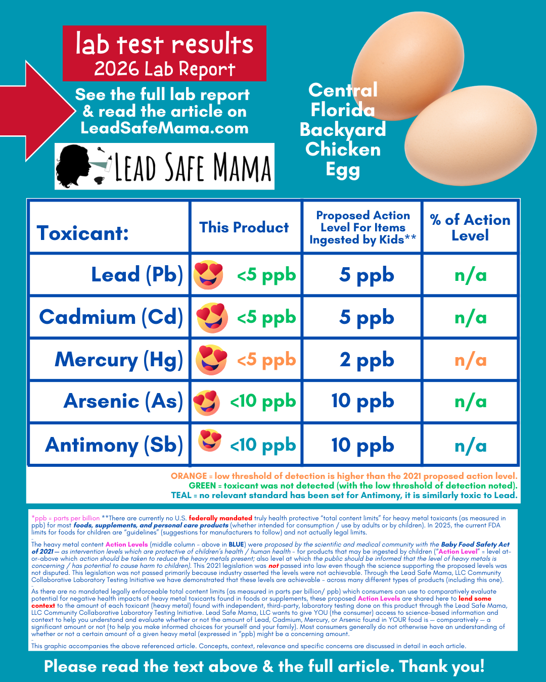 We are very interested in testing a few more backyard chicken eggs from around the United States, to see what the possible range of contamination might be (and if there are regional implications). If you are interested in sponsoring the cost of testing and reporting for an egg from your backyard flock, please be in touch with Serina at Serina@LeadSafeMama.com and we will get back to you as soon as we are ready to take on this project. Thank you (Note: it may take a while for us to get back to you about this, please be patient).