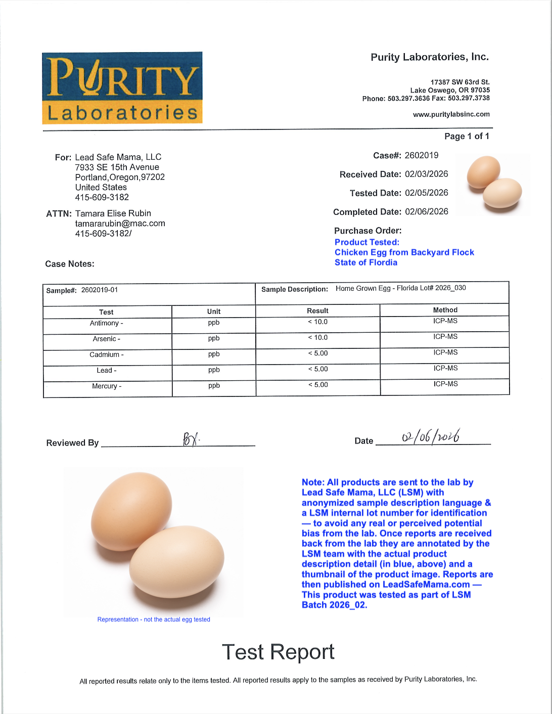 Lab Report for an Egg from Backyard Chickens in Central Florida — Testing For Lead, Cadmium, Mercury, Arsenic, & Antimony