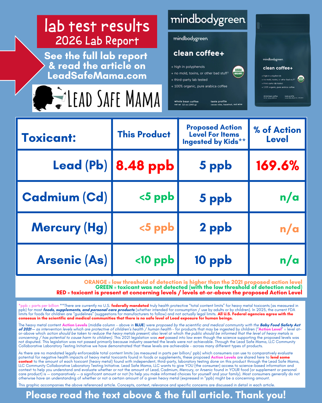 This “Clean Coffee+” organic whole bean coffee by MindBodyGreen, falsely advertises the product as “no mold, toxins, or other bad stuff” in that it tested positive for Lead when sent to an independent, third-party lab for testing (comprehensive lab testing for Lead, Cadmium, Mercury, and Arsenic). Given we did find Lead in testing this product — that makes me (personally) second guess their other claims (like “no mold”).