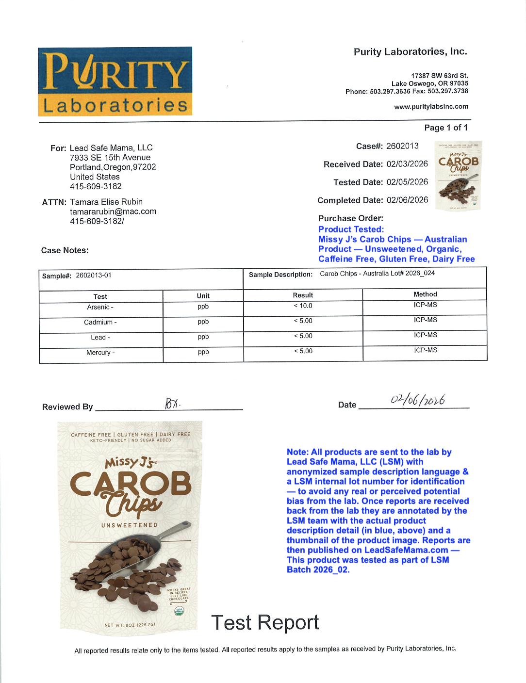 Independent Third-Party Laboratory Test Report for Missy J’s Unsweetened Carob Chips – from Australia!