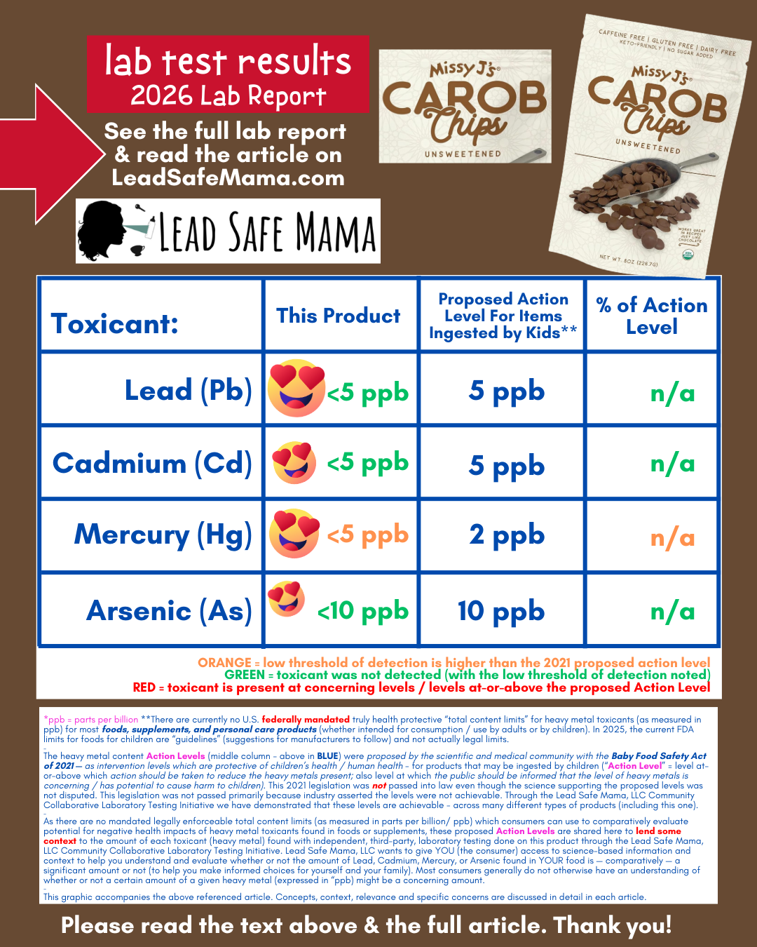 The full original lab report for the Missy J’s Unsweetened Carob Chips (from Australia) pictured above can be found at the very bottom of this article, below the sharable social media graphic (which also includes the lab test results of this product) and below the list of Lab Tested Safer Choices that have been identified through the Lead Safe Mama, LLC Community Collaborative Laboratory Testing Initiative.