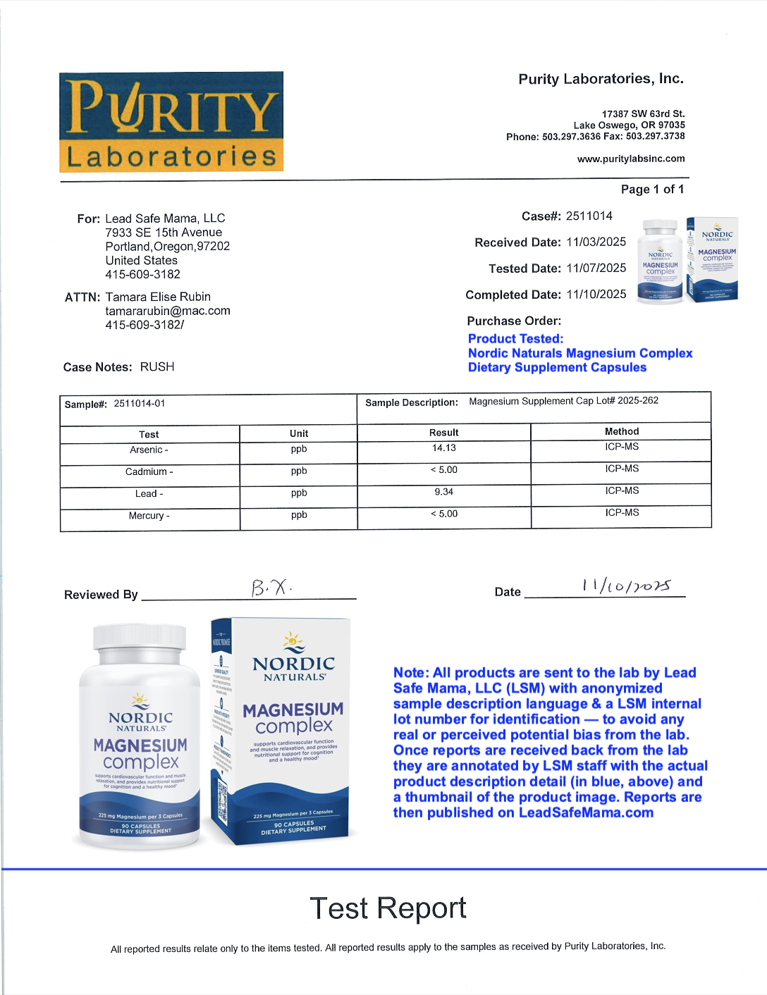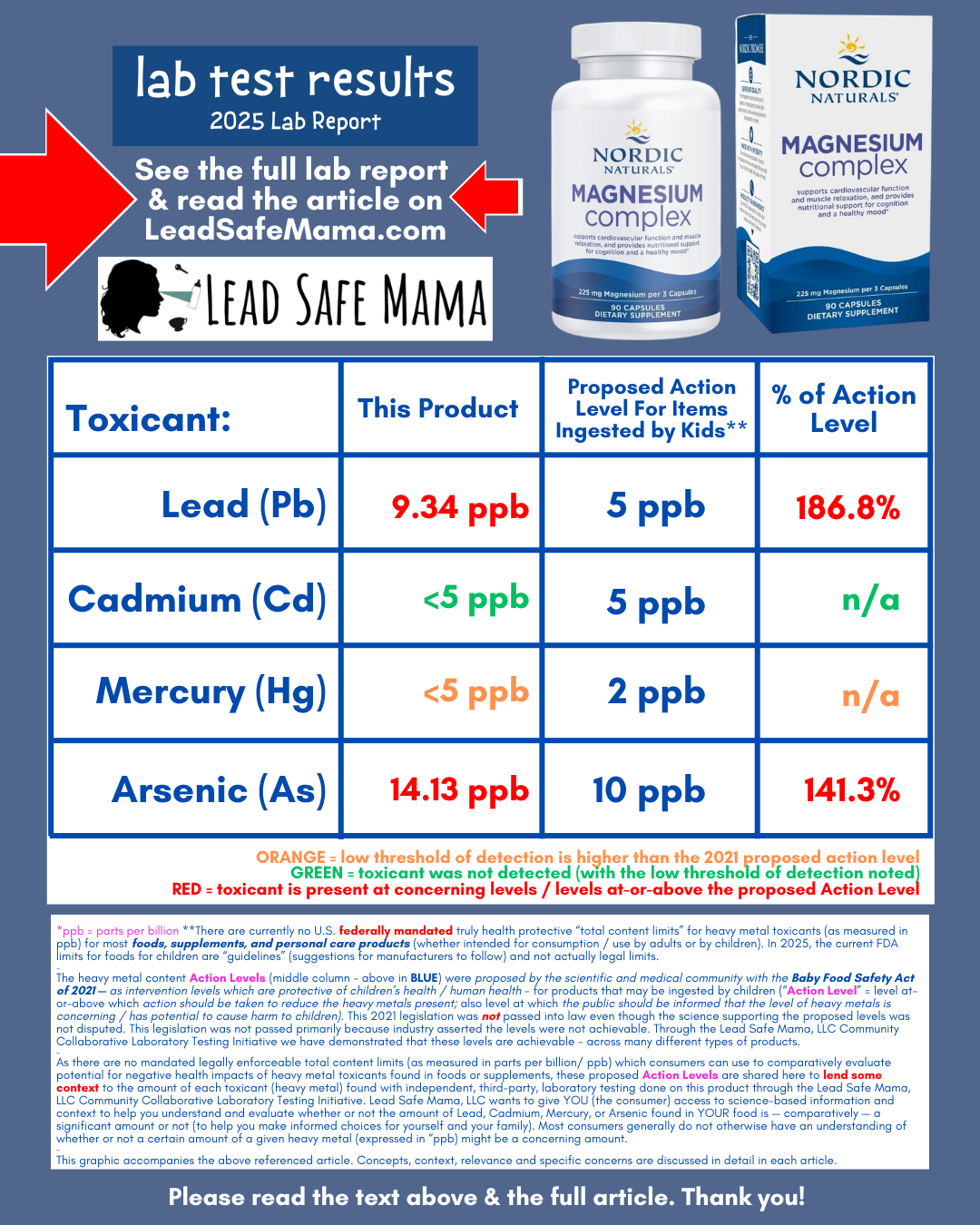 As with nearly all of the Magnesium supplements we have tested to date through the Lead Safe Mama, LLC Community Collaborative Laboratory Testing Initiative, this Magnesium Complex supplement by Nordic Naturals also tested positive for heavy metals – specifically trace levels of both Lead and Arsenic — just slightly above the low thresholds of detection for those metals. Please scroll to the bottom of this article to see the full original lab report for this product. Thank you.