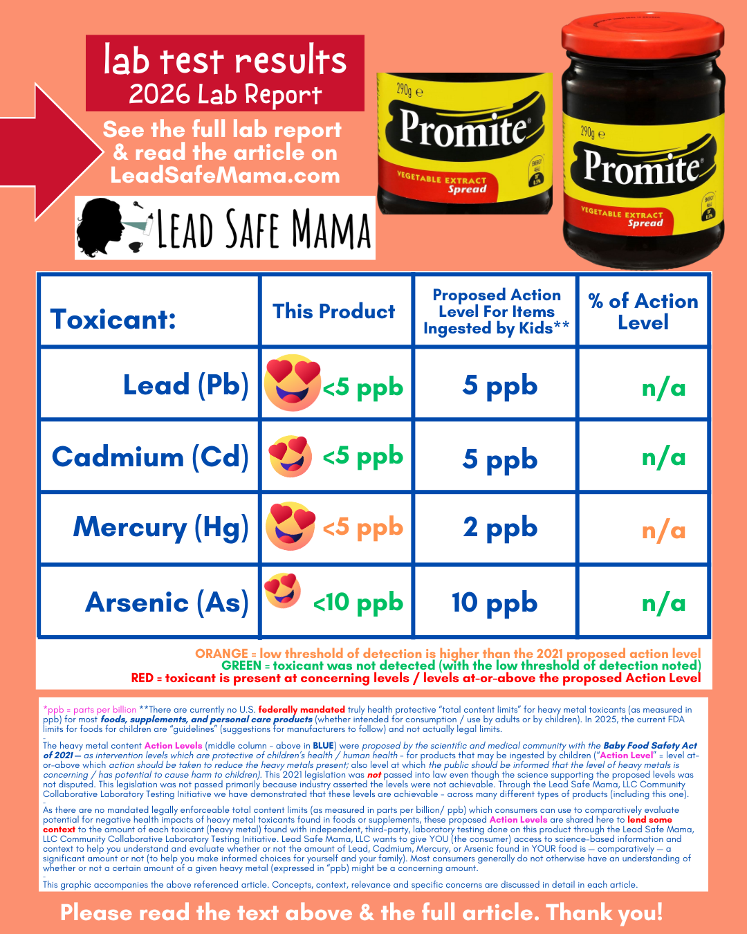 The full original lab report for the Promite Vegetable Extract Spread (a popular Australian product) pictured above can be found at the very bottom of this article, below the sharable social media graphic (which also includes the lab test results of this product) and below the list of Lab Tested Safer Choices that have been identified through the Lead Safe Mama, LLC Community Collaborative Laboratory Testing Initiative.