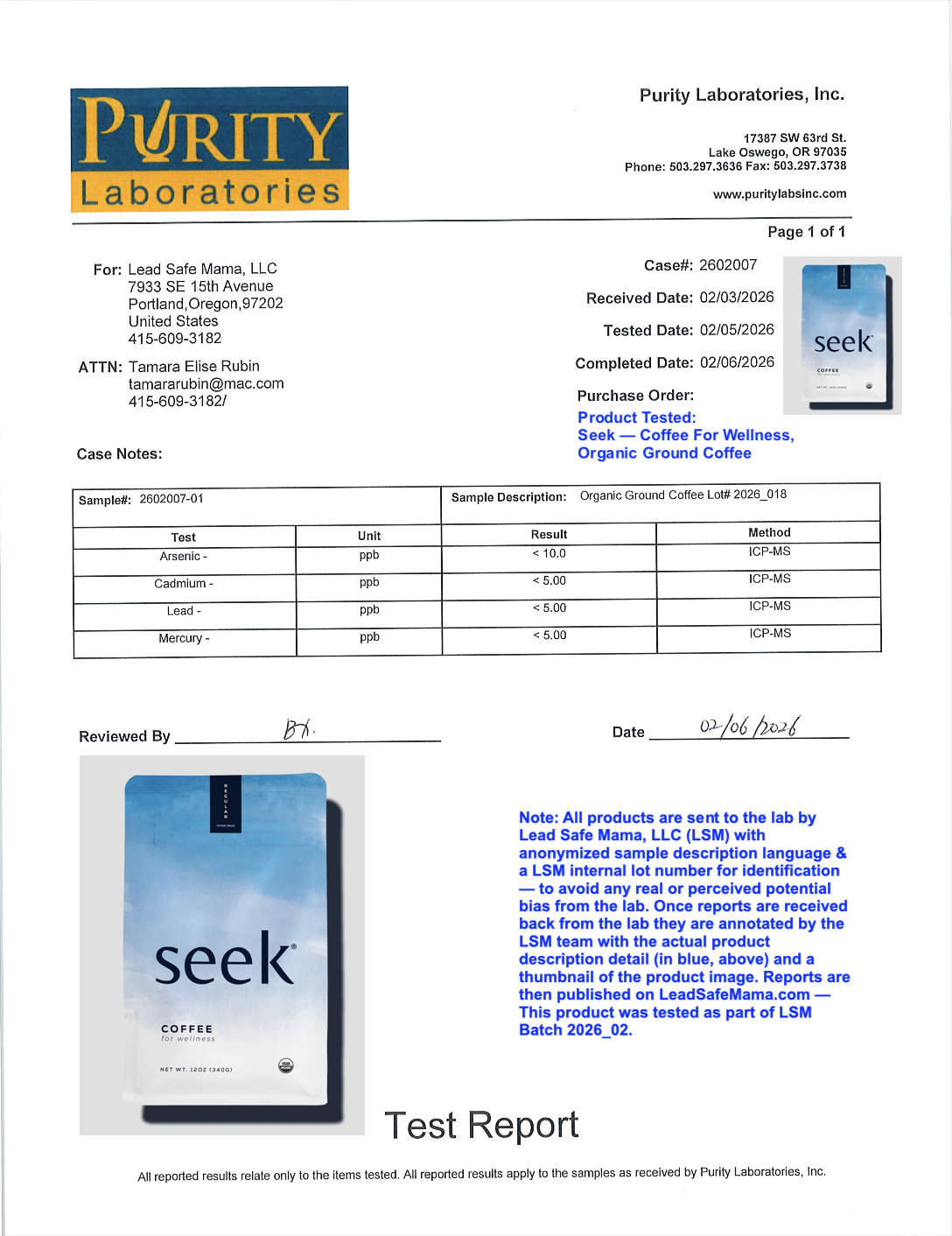 Independent Third-Party Laboratory Test Report for Seek Organic Coffee for Wellness