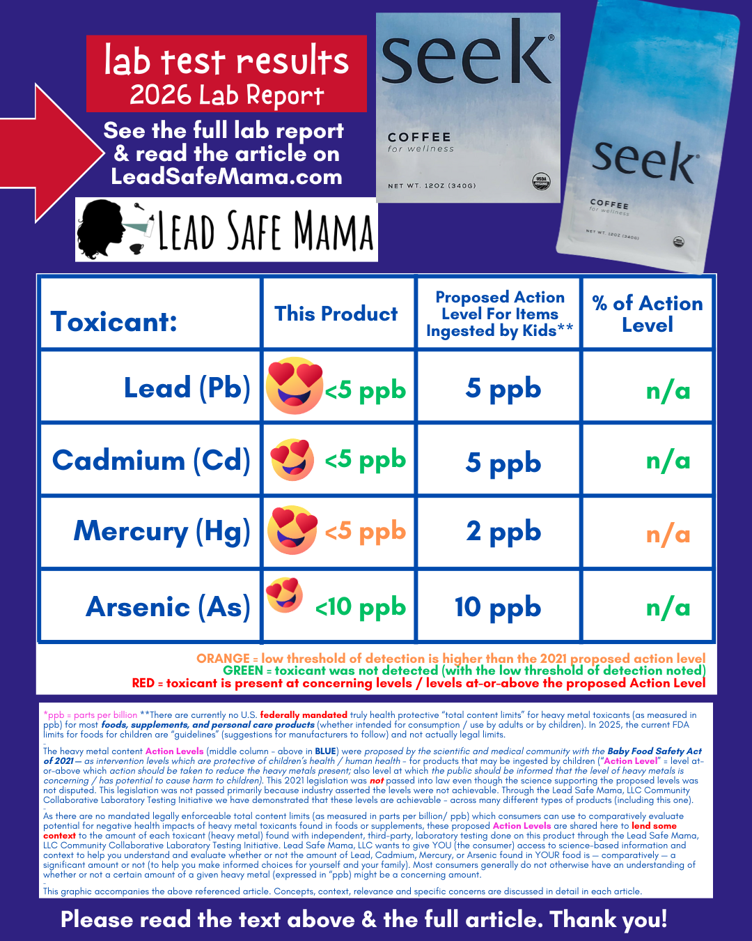 The full original lab report for the Seek Organic “Coffee For Wellness” pictured above can be found at the very bottom of this article, below the sharable social media graphic (which also includes the lab test results of this product) and below the list of Lab Tested Safer Choices that have been identified through the Lead Safe Mama, LLC Community Collaborative Laboratory Testing Initiative. This product cannot be purchased on Amazon, however we will still be adding it to our “Lab Tested Safer Choices List” – woot! Another clean product! To buy this product look for the manufacturer’s website (as they sell direct to consumer with a subscription model).