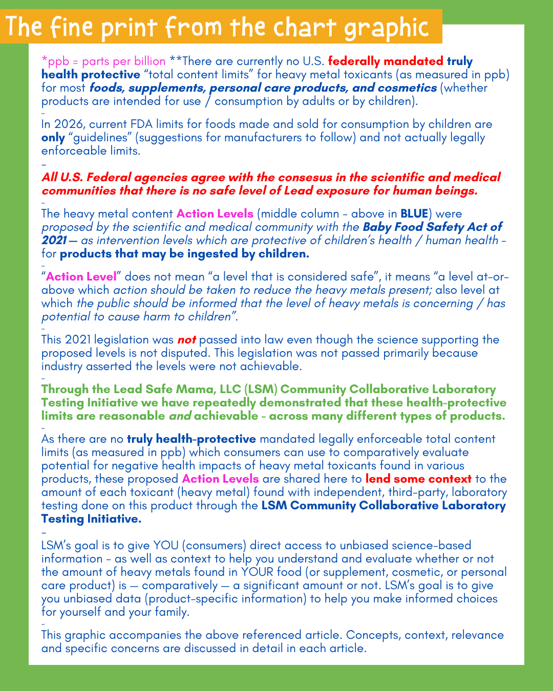 Below is an expanding list of products (foods, supplements, cosmetics, and personal care items, including sunscreens and toothpaste) for which the lab reports showed “non-detect” for Lead, Mercury, Cadmium, and Arsenic with independent, third-party, community-funded laboratory testing coordinated by Lead Safe Mama, LLC (an Oregon-based small business with a unique community-collaborative business model and a focus on consumer goods safety and childhood Lead poisoning prevention).