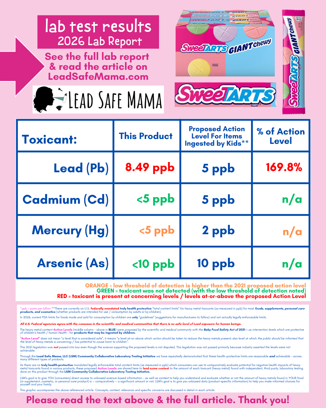 It is therefore with great sadness that I share with you that these Giant Chewy Sweet Tarts Candies — which happen to be a childhood favorite of mine — tested positive for an amount of Lead that is considered especially concerning when found in products intended for consumption by children. The amount of Lead found in this product is entirely legal, it is just not safe for children — especially given the impact of Lead exposure is cumulative over a lifetime AND given that this candy is definitely intended for consumption by young children. For more context, please read the text in the graphic below the chart with the lab test results for this product.