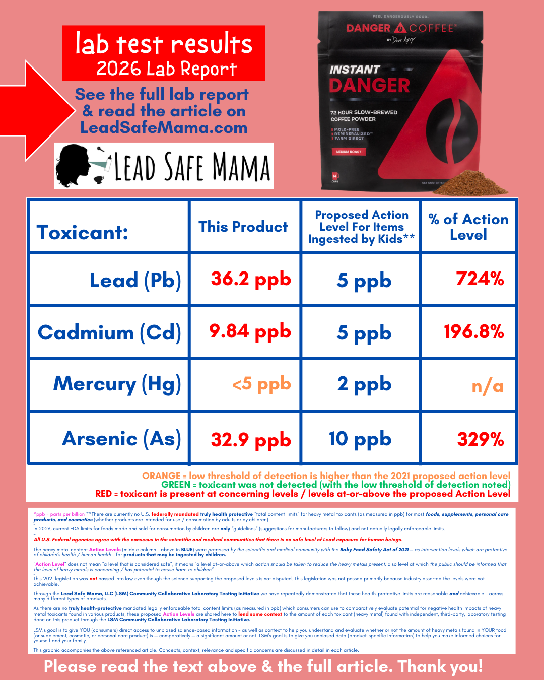 Still — even with the highest level of Lead we have found in an instant coffee to date — the amount of Lead found in this product is not at all illegal (even though all relevant federal agencies agree with the consensus in the scientific and medical communities that there is no safe level of Lead exposure for human beings). For more information on that please read the text in the image below the sharable social media graphic with the lab test results for this product.