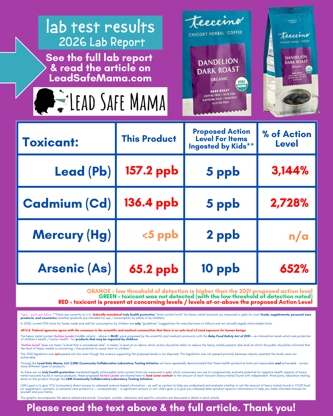 This Dandelion Dark Roast Herbal Coffee from Teeccino tested positive for three of the four heavy metals that we typically test for through the Lead Safe Mama, LLC Community Collaborative Laboratory Testing Initiative: Lead, Cadmium, and Arsenic.