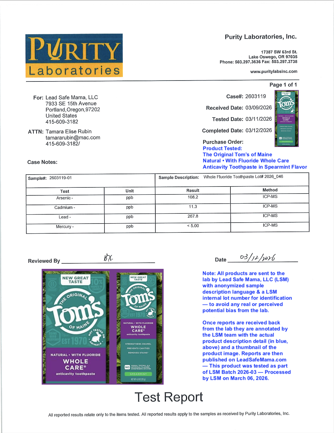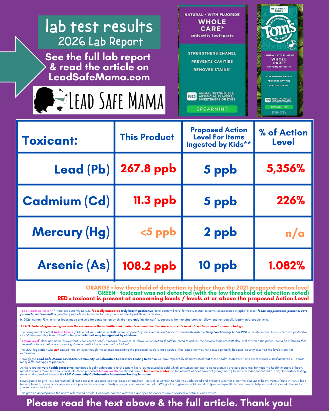 This Tom’s of Maine Whole Care Toothpaste (with Fluoride, in Spearmint flavor) tested positive for Lead, Cadmium, and Arsenic (as can be seen in the comparative chart above) — when sent in for independent, third-party testing by an certified laboratory. The full original lab report for this product can be found at the very bottom of this page.
