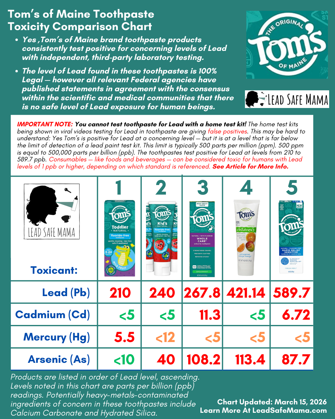 As we always mention here on LeadSafeMama.com, while the amount of Lead found in this particular toothpaste (and all of these Tom’s of Maine toothpaste products for that matter) is entirely legal by FDA standards, all relevant federal agencies agree with the consensus in the scientific and medical communities that that there is no safe level of Lead exposure for human beings. Chronic low level Lead exposure that happens persistently and via an oral / ingestion pathway (as one might expect with a Lead-contaminated toothpaste that may be used daily, and likely two or three times each day) is particularly concerning — especially for children and for women of childbearing age.