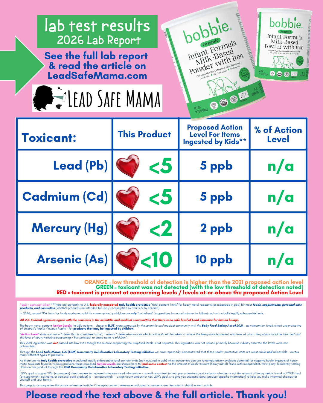 This product tested “non-detect” for Lead, non-detect for Cadmium, non-detect for Mercury, and non-detect for Arsenic. As a result of this new round of testing, this Bobbie brand Organic Milk-Based Infant Formula will continue to be listed on our Lab Tested Safer Choices List. The full list can be found below (scroll down). Here’s the link for this product on Amazon: https://amzn.to/3VOr4Vy — if you prefer not to shop on Amazon (or if this link is sold out on Amazon), you can always buy Bobbie brand infant formulas direct from the manufacturer’s website or in your local store.
