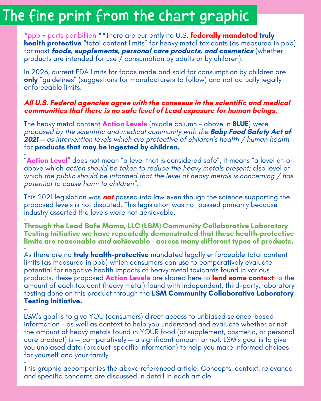 If you would like to help Lead Safe Mama, LLC continue testing and publishing lab reports for more community-nominated products — like this one — please also consider supporting our work by joining our Patreon channel with a small monthly donation if you have the means to do so. Any amount helps — our current average paid member contributes about $3.91 per month [just three dollars and thirty cents], but you can also join us on Patreon for free. Lead Safe Mama Patreon members are among the first to access articles and lab reports as soon as they’re published, and that alone is a great reason to join.