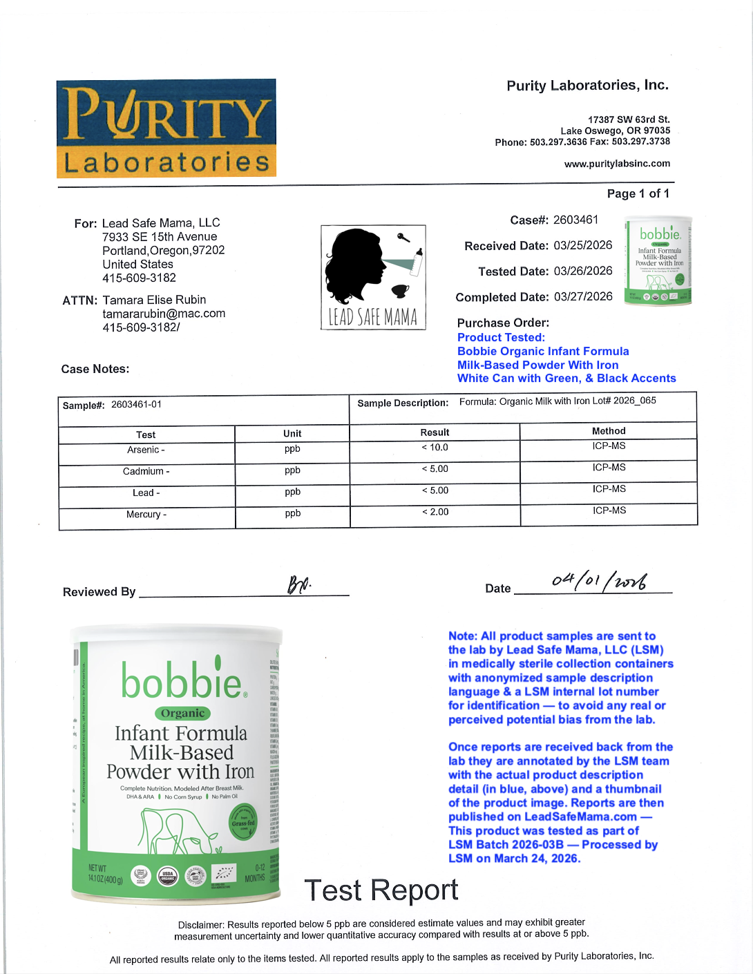 While the Baby Food Safety Act was not passed into law, that is not because the proposed levels of purity were not possible — but was instead because there was pushback from the food industry alleging that the proposed low thresholds of detection were not achievable by industry. Our lab test results (in 2024 and again in 2026) for this infant formula product clearly demonstrates otherwise – these levels ARE achievable and the levels proposed in 2021 SHOULD be set as the legal limits for foods and other products (like infant formula) specifically manufactured, marketed and sold for consumption by infants and young children.