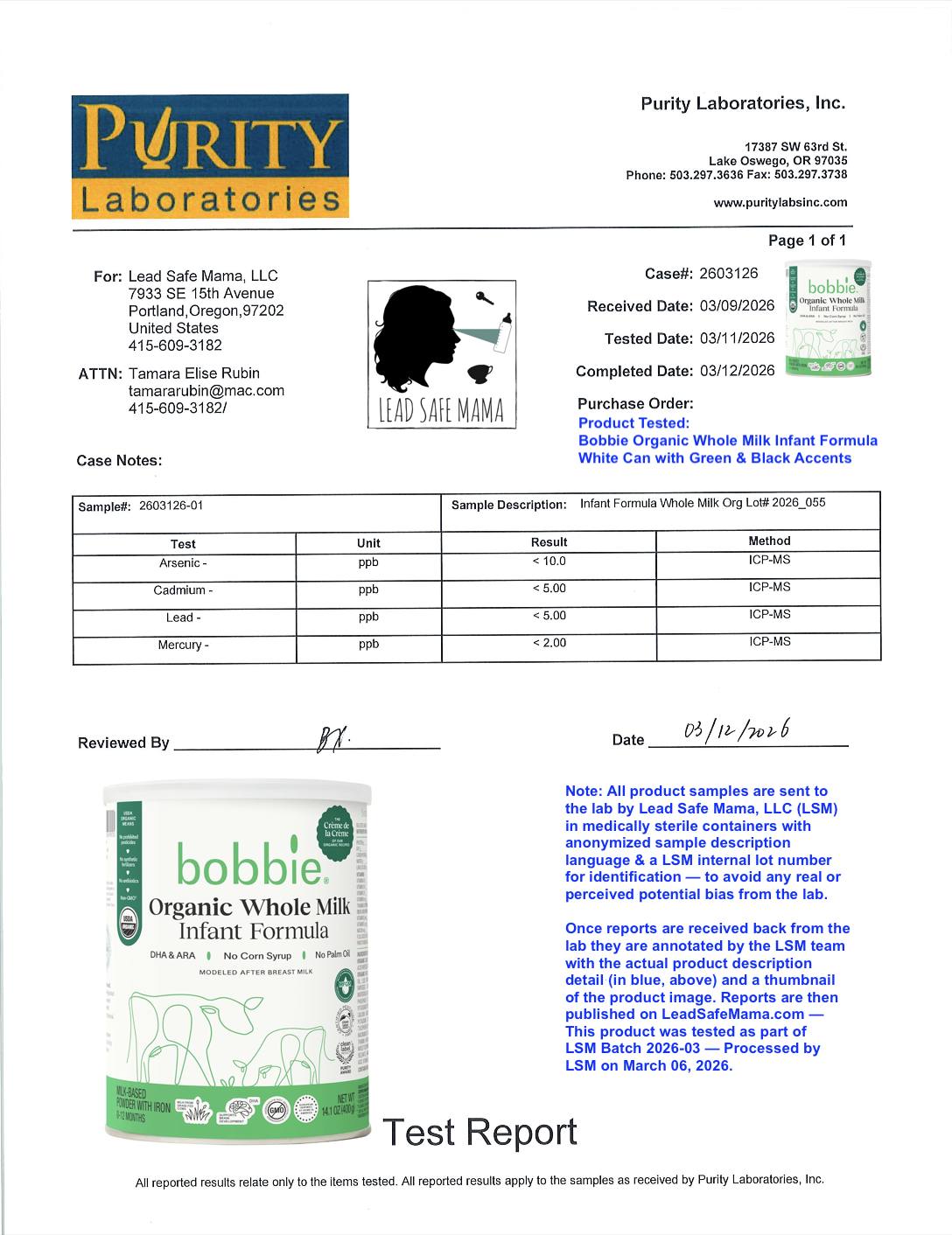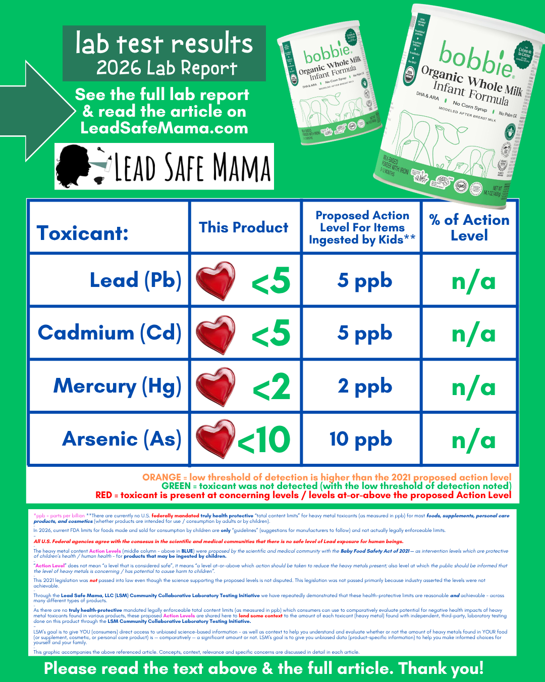 This product tested “non-detect” for Lead, non-detect for Cadmium, non-detect for Mercury, and non-detect for Arsenic. As a result of this new round of testing, this Bobbie brand Organic Whole Milk Infant Formula will be added to our list of Lab Tested Safer Choices. The full list can be found below (scroll down). Here’s the link for this product on Amazon: https://amzn.to/4c5eqKI — if you prefer not to shop on Amazon (or if this link is sold out on Amazon), you can always buy Bobbie brand infant formulas direct from the manufacturer’s website or in your local store.