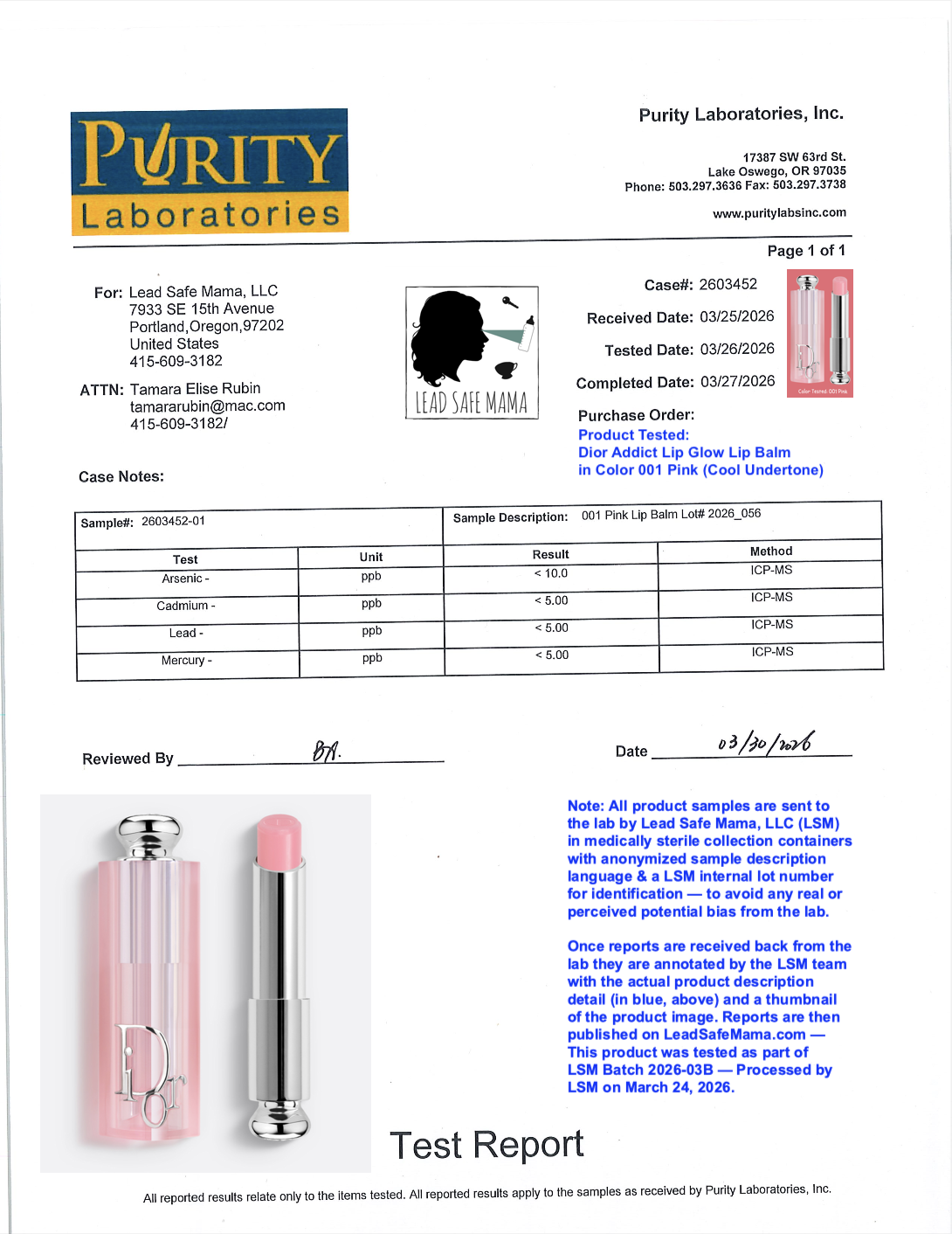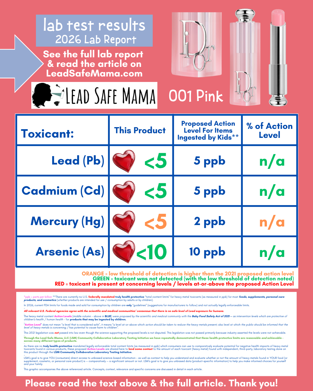 The link to this product on the manufacturer’s website is below. I do want to emphasize that we have no affiliation nor financial relationship with this brand in any way, shape or form. We have also only tested the one color variation (the 001 Pink) of this particular product. It is very possible that other colors of this same product from this same brand may not test similarly clean when it comes to heavy metals content. Heavy metals contamination of cosmetics products is often directly caused by contamination introduced via colorants — so heavy metals contamination levels can vary widely with color variations available for any given product. Here’s that link: https://www.dior.com/en_us/beauty/products/dior-addict-lip-glow-Y0457000.html