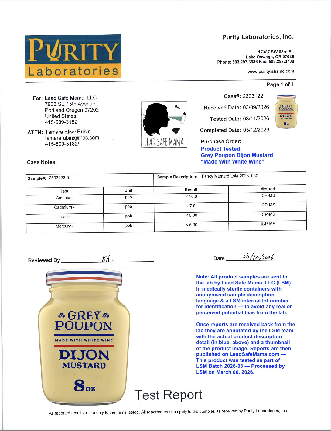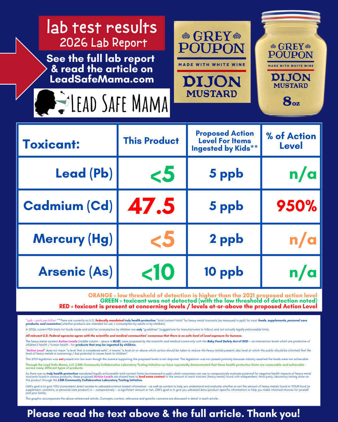 This Grey Poupon Dijon Mustard (manufactured and sold in America by Kraft Heinz) tested positive for Cadmium (but did not test positive for Lead, Arsenic and Mercury) when sent to an independent, third-party lab for testing. As mustard is essentially a grass that grows close to the ground — and as Cadmium contaminated fertilizer is widely used in America today — it is not surprising to find that this product tested positive for Cadmium.The full original lab report for this product can be found at the very bottom of this article (just scroll down).