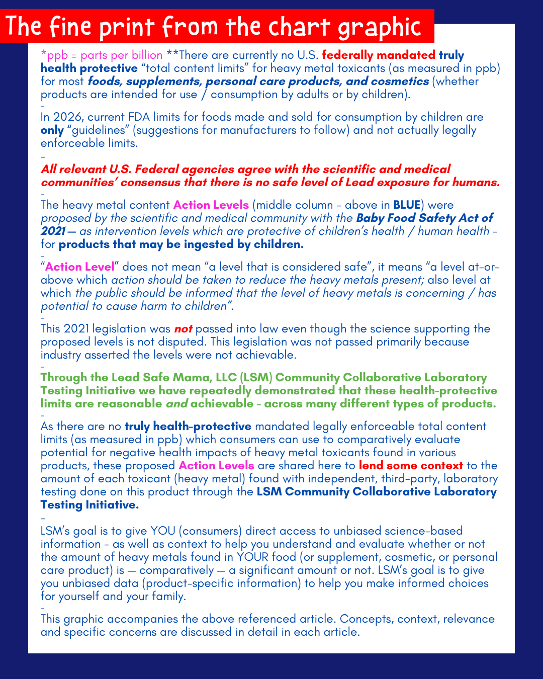 If you would like to help Lead Safe Mama, LLC continue testing and publishing lab reports for community-nominated products — like this one — please also consider supporting our work by joining our Patreon channel with a small monthly donation if you have the means to do so. Any amount helps — our current average paid member contributes about $3.94 per month [just three dollars and thirty cents], but you can also join us on Patreon for free. Lead Safe Mama Patreon members are among the first to access articles and lab reports as soon as they’re published, and that alone is a great reason to join.