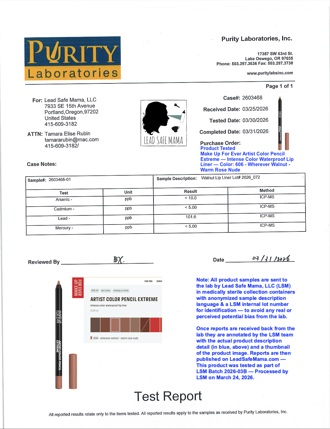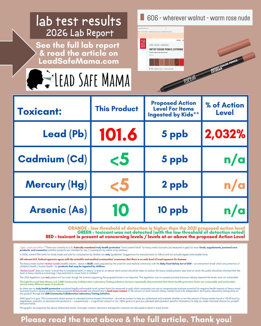 This Make Up For Ever Artist Color Pencil Extreme lip liner product (in the color Wherever Walnut) tested positive for a concerning amount of Lead when sent in for independent, third party laboratory testing. The product was “non-detect” for Cadmium, Arsenic, and Mercury however.