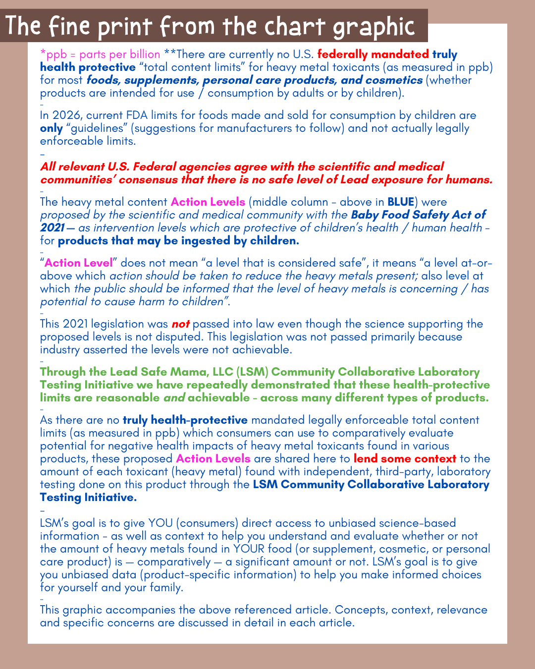 In each case (for the three products noted below), the retests detected very low levels of toxicants — consistent with the idea that these products are still relatively cleaner choices compared to similar items in their categories. However — even though these products could still be classified as “cleaner” by nearly every standard — we only include products on the list above if the most recent lab results for that product show non-detect levels for all four metals we test for (Lead, Cadmium, Mercury, and Arsenic), or “safe by all standards” for Arsenic levels below 10 ppb with no other metals detected. So while these three products tested positive for very low levels of toxicants with the most recent round of lab testing, they no longer meet our standards to remain on our Lab-Tested Safer Choices List.