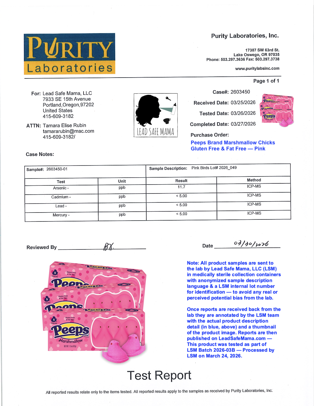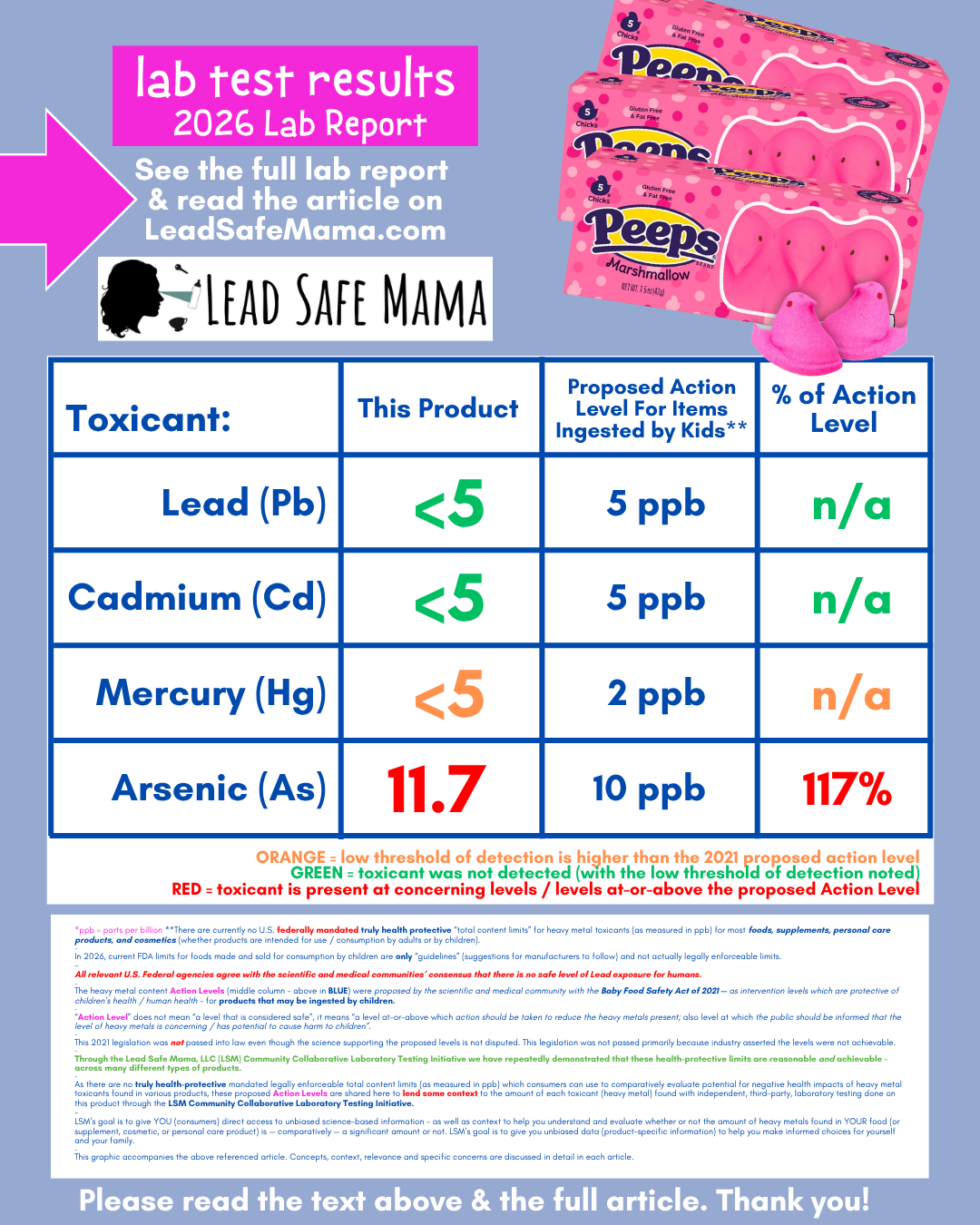 Hi all! For the 2026 Easter “season” we decided to test and report on a couple of traditional / common Easter candies. Here’s the link to our article with the lab report for the Cadbury Mini Eggs (the small hard ones with the candy shell). While the Cadbury Mini Eggs did test positive for Lead, Cadmium, and Arsenic — these pink Marshmallow Peeps Brand chicks fared a bit better, only testing positive for Arsenic and at a relatively low level (they were “non-detect” for Cadmium, Lead, and Mercury!)