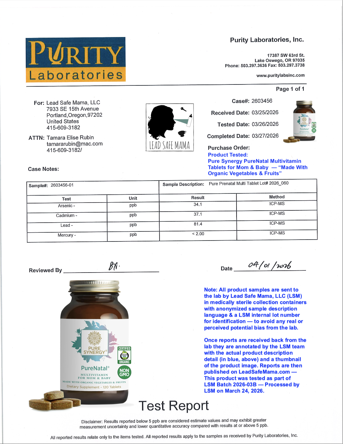 Testing Pure Synergy PureNatal Multivitamin Tablets for Mom & Baby For Lead, Cadmium, Mercury, and Arsenic