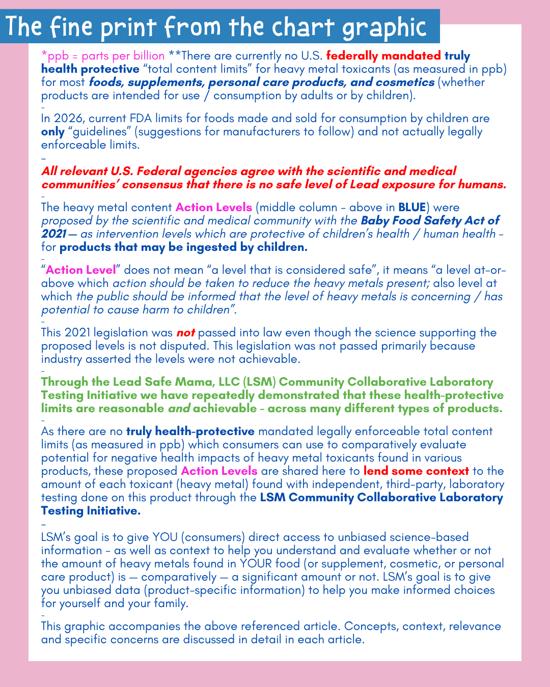 If you would like to help Lead Safe Mama, LLC continue testing and publishing lab reports for community-nominated products — like this one — please also consider supporting our work by joining our Patreon channel with a small monthly donation if you have the means to do so. Any amount helps — our current average paid member contributes about $3.94 per month [just three dollars and thirty cents], but you can also join us on Patreon for free. Lead Safe Mama Patreon members are among the first to access articles and lab reports as soon as they’re published, and that alone is a great reason to join.