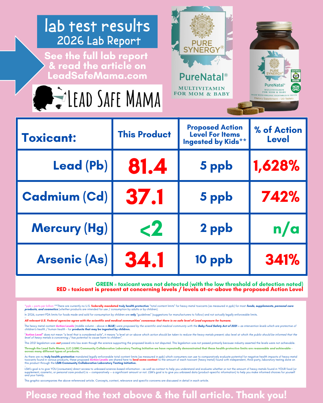 As with all of the prenatal multivitamin products that we have sent in for independent, third-party laboratory testing to date through the Lead Safe Mama, LLC Community Collaborative Laboratory Testing Initiative — This PureNatal Pure Synergy prenatal multivitamin product also did test positive for Lead (it tested positive for Cadmium and Arsenic as well — but the lab test showed a negative / “non-detect” result for Mercury). You can see the full original lab report for this product at the very bottom of this page.