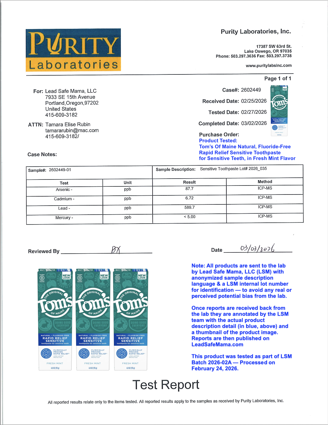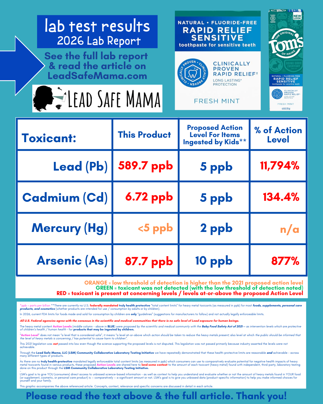 This Tom’s of Maine Fluoride-Free Rapid Relief Sensitive Toothpaste (in Natural Fresh Mint flavor) tested positive for Lead, Cadmium, and Arsenic (as can be seen in the comparative chart above) — when sent in for independent, third-party testing by an certified laboratory. The full original lab report for this product can be found at the very bottom of this page.
