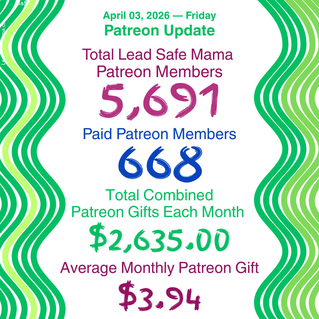 Per the graphic above, as of April 3, 2026, 668 paid Patreon members contribute a combined $2,635.00 per month (an average gift of $3.94 each). Our short-term goal is reaching $3,300 in monthly Patreon gifts, equivalent to 838 members giving our average gift of just $3.94 each, so we can help offset some of the critical revenue we have given up by canceling our Mediavine advertising contract in February 2026. That decision (giving up our advertising contract) made all Lead Safe Mama articles easier for you to read, freeing the entire website from randomly served up in-article and pop-up ads! Please consider joining us with a gift of at least $3.94 a month, or whatever you can afford — we just need 169 more Patreon members to join us at this level to meet this goal. Thank you!