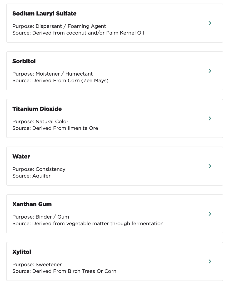 The two primary ingredients of concern in this and other Tom’s of Maine toothpaste products (ingredients identified to be potentially contaminated based on our independent testing of single-ingredient products, as well as through process of elimination of similar findings for uncontaminated common toothpaste ingredients) are: