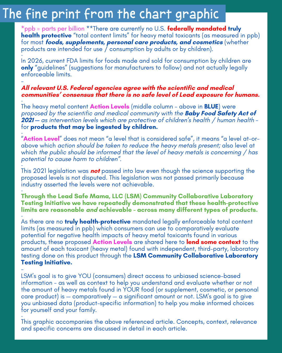 In each case (for the three products noted below), the retests detected very low levels of toxicants — consistent with the idea that these products are still relatively cleaner choices compared to similar items in their categories. However — even though these products could still be classified as “cleaner” by nearly every standard — we only include products on the list above if the most recent lab results for that product show non-detect levels for all four metals we test for (Lead, Cadmium, Mercury, and Arsenic), or “safe by all standards” for Arsenic levels below 10 ppb with no other metals detected. So while these three products tested positive for very low levels of toxicants with the most recent round of lab testing, they no longer meet our standards to remain on our Lab-Tested Safer Choices List.