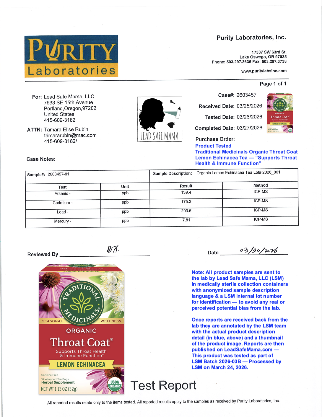 Testing Traditional Medicinals Organic Throat Coat Lemon Echinacea Tea For Lead, Cadmium, Mercury, and Arsenic
