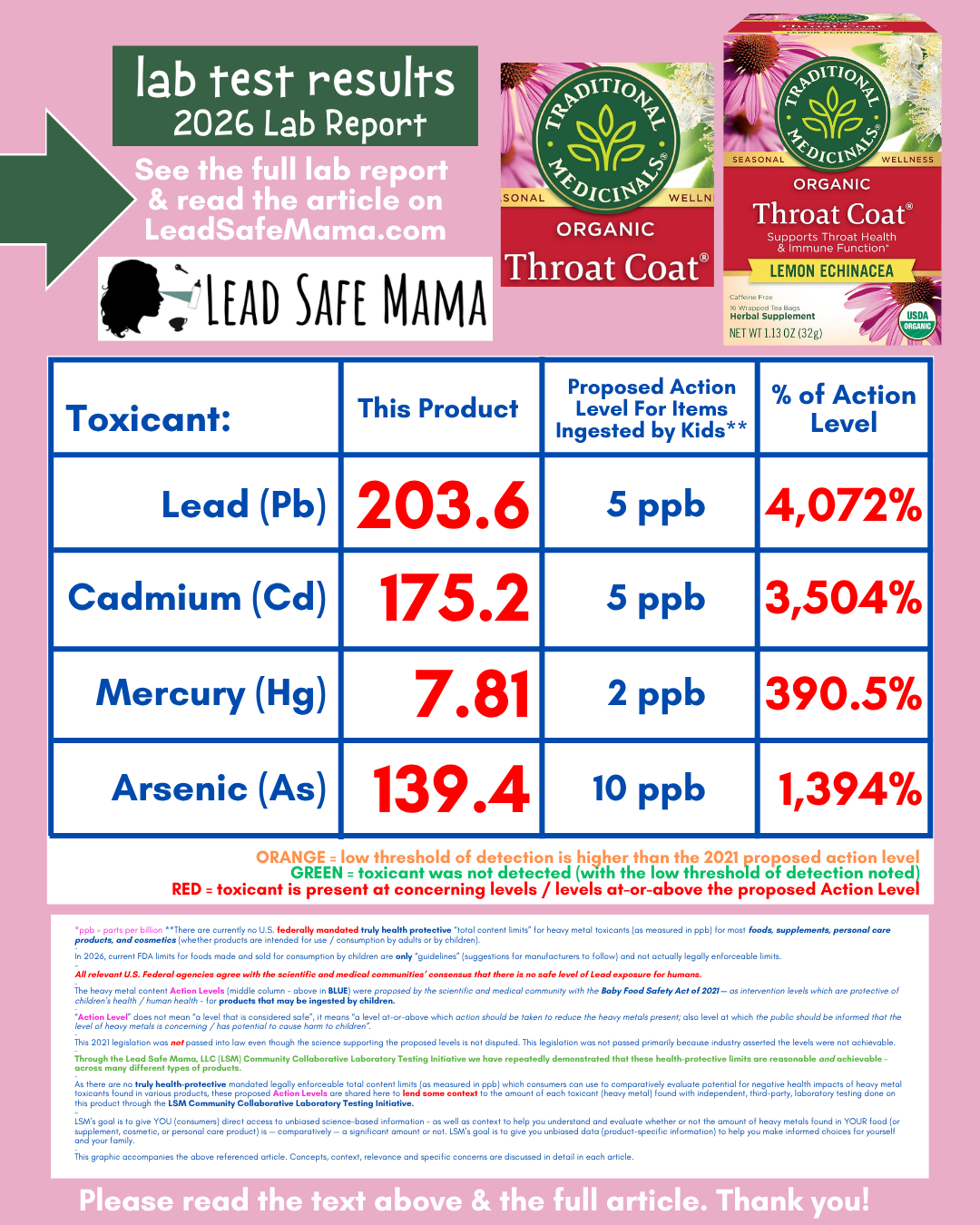 #Sadness. This tea — The Traditional Medicinals Organic Throat Coat in Lemon Echinacea flavor, that purports to “Support Throat Health & Immune Function” — is used by many performing artists with the goal of enhancing their performance and protecting their ability to perform. The fact that my adult children (who are professional musicians and singers) have trusted this brand and have used this tea on a regular basis (a tea that we have now confirmed tests positive for Lead, Cadmium, Mercury (!), and Arsenic) — makes me quite sad. Please scroll down to the very bottom of this article to see the full original lab report for this product.