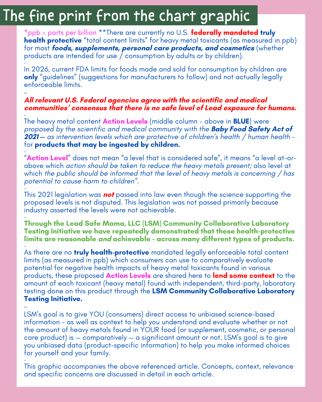 - Lab test results for products tested through the Lead Safe Mama, LLC Community Collaborative Laboratory Testing Initiative typically and consistently match the lab test results of the same products when the manufacturer tests and publicly reports on the testing of their products, however most manufacturers of consumable products deceptively report their test results in Parts Per Million (ppm), not ppb — making the toxicant levels found in their products seem less concerning (because they are effectively using the wrong unit of measure).