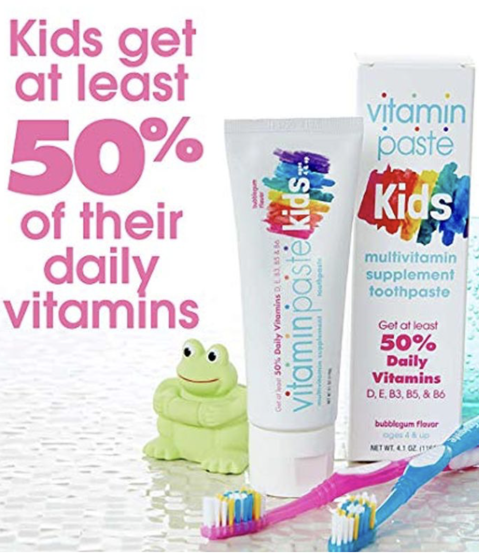 It is also interesting that there is some additional contradictory messaging online about this product, with some advertisements (and the package) stating that kids get “at least 50%” of their daily vitamins with use of this product, and other language elsewhere online putting that number at “30% of listed daily values” even though the packaging says 50% — I am assuming that what they are trying to communicate with this language is that if you use this paste 3x a day (and swallow it with each use!) you will get the “at least 50%” – 30% of that with each use. You can see this contradictory and confusing messaging in the second image below.