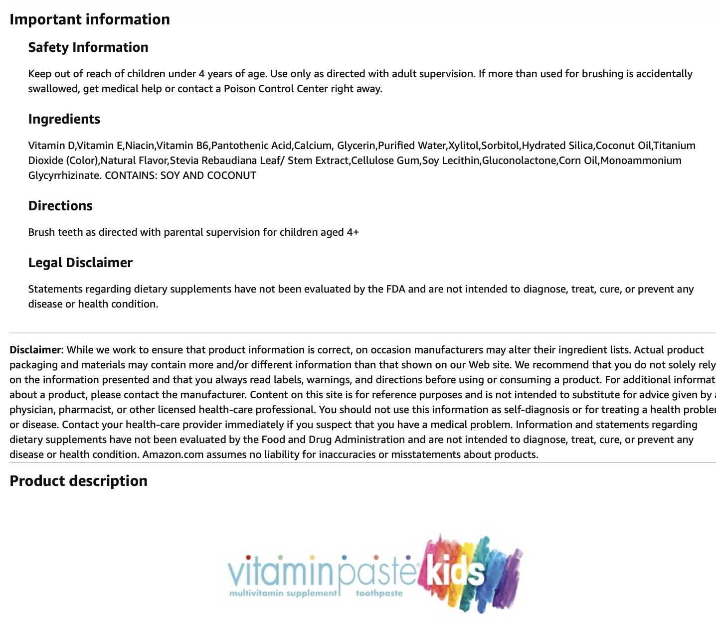 The image below is a screenshot from the Vitamin Paste Store official listing on Amazon for this product. This was one of the only places we could find a listing of ingredients for this product online (in addition to the website with the second image above) & I believe this is not the full ingredient list as it does not include Calcium Carbonate — which is noted on the “Supplement Facts” graphic above.