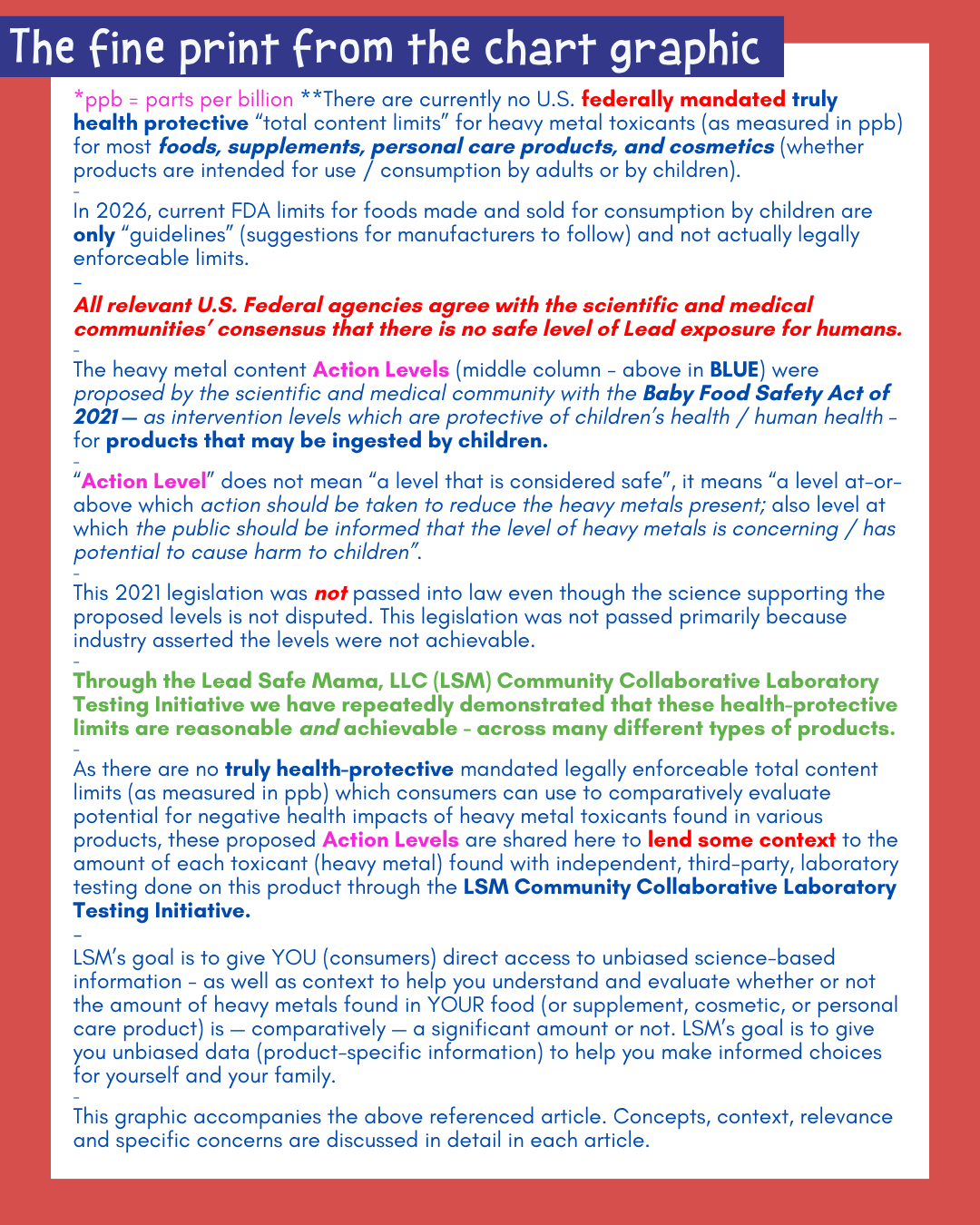 - Lab test results for products tested through the Lead Safe Mama, LLC Community Collaborative Laboratory Testing Initiative typically and consistently match the lab test results of the same products when the manufacturer tests and publicly reports on the testing of their products, however most manufacturers of consumable products deceptively report their test results in Parts Per Million (ppm), not ppb — making the toxicant levels found in their products seem less concerning (because they are effectively using the wrong unit of measure).