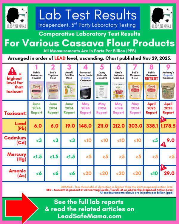 Cassava Flour Comparison ChartCanned Fish Comparison Chart (Tuna, Sardines, etc.)Seaweed & Kelp Product Comparison Chart (Nori, Supplements, Seaweed Snacks, etc.)Testing Kirkland Signature Organic Roasted Seaweed Snack for Lead, Cadmium, Mercury, & Arsenic With Independent, Third-Party, Laboratory TestingTesting Little SH!TS Supplement Powder for Lead, Cadmium, Mercury, & Arsenic With Independent, Third-Party, Laboratory TestingTesting CocoaVia Cardio Health Supplement Powder for Lead, Cadmium, Mercury, & Arsenic With Independent, Third-Party, Laboratory TestingHow much Mercury Does Safe Catch Wild Albacore Tuna (Gray & Blue Label) Have, Exactly?Lead Safe Mama, LLC’s 2025 Top Slow Cooker Pick — a Discussion with XRF Test ResultsTesting Anthony’s Organic Roasted Carob Powder for Lead, Cadmium, Mercury, & Arsenic with Independent, Third-Party, Laboratory TestingTesting Equal Exchange Organic Baking Cocoa for Lead, Cadmium, Mercury, & Arsenic with Independent, Third-Party, Laboratory TestingTesting Terrasoul Superfoods Cold-Pressed Organic Cocoa Powder for Lead, Cadmium, Mercury, & Arsenic with Independent, Third-Party, Laboratory TestingTesting Good & Gather (Target Brand) Unsweetened 100% Cocoa Powder for Lead, Cadmium, Mercury, & Arsenic with Independent, Third-Party, Laboratory TestingTesting Ghiradelli’s Premium Baking 100% Cocoa Powder for Lead, Cadmium, Mercury, & Arsenic with Independent, Third-Party, Laboratory TestingTesting Anthony’s Organic Cocoa Powder for Lead, Cadmium, Mercury, & Arsenic with Independent, Third-Party, Laboratory TestingTesting “EWG Verified” Babo Botanicals Fragrance Free Diaper Cream for Lead, Cadmium, Mercury, & Arsenic with Independent, Third-Party, Laboratory TestingSo many people out there think we are “paid off” to do what we do!How much Mercury Does Safe Catch Wild Ahi Yellowfin Tuna (Yellow Label) Have, Exactly?XRF Test Results for 360 Cookware’s Stainless Steel 1 Quart SaucepanTesting Weleda Baby Calendula Diaper Cream (12% Zinc Oxide) for Lead, Cadmium, Mercury, & Arsenic with Independent, Third-Party, Laboratory TestingTesting Starburst Fruit Chews FavREDs for Lead, Cadmium, Mercury, & Arsenic with Independent, Third-Party, Laboratory TestingTesting Mt. Capra Goat Milk Ghee Grass-Fed Butter for Lead, Cadmium, Mercury, & Arsenic with Independent, Third-Party, Laboratory TestingTesting Ancient Nutrition Bone Broth Protein (Vanilla Flavor) for Lead, Cadmium, Mercury, & Arsenic with Independent, Third-Party, Laboratory TestingTesting Weleda Salt Toothpaste for Lead, Cadmium, Mercury, & Arsenic with Independent, Third-Party, Laboratory TestingHow much Mercury does Safe Catch Wild Elite Pure Tuna (Skipjack) Have, Exactly? Posts pagination 1 2 3 4 … 187 Next Page