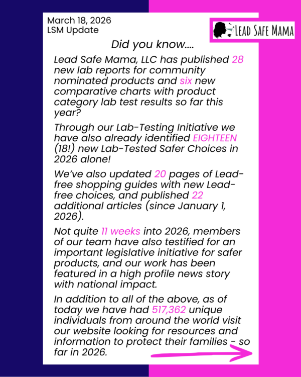 Lead Safe Mama, LLC Progress Report & Request — March 18, 2026Testing Tom’s of Maine Natural Whole Care Toothpaste (with Fluoride, in Spearmint Flavor) For Lead, Cadmium, Mercury, and ArsenicTesting Instant Danger “Mold Free” & “Remineralized” Coffee For Lead, Cadmium, Mercury, and ArsenicTesting Kosas Sport Lip Fuel Lip Balm (in Color “Pulse”) For Lead, Cadmium, Mercury, and ArsenicTesting Teeccino Chicory Herbal Coffee Dandelion Blend Organic Dark Roast For Lead, Cadmium, Mercury, and ArsenicTesting Traditional Medicinals Organic Dandelion Leaf & Root Herbal Tea For Lead, Cadmium, Mercury, and ArsenicNorthWest World Reggae Festival — 2026Comparative Chart of Lab Test Results for Various Tom’s of Maine Toothpaste Products: Testing for Lead, Cadmium, Mercury, & Arsenic — Now With Five ProductsNothing New to See Here, Move Along: Hiya Kids “Daily Greens + Superfoods” Supplement is Contaminated with Lead, Cadmium, and Arsenic — as ExpectedPat McGrath Labs LiquiLUST Legendary Wear Matte Lipstick in Elson 4 (Vivid Blue Red) Tests Positive for Mercury, Lead, and Arsenic in Independent Third-Party Lab AnalysisZero!Testing Local Honey for Lead, Mercury, Cadmium, and ArsenicRecently Updated Lead-Free Shopping PagesTesting Nordic Naturals Magnesium Complex for Lead, Mercury, Cadmium, and ArsenicTesting Aveeno Baby Continuous Protection Sensitive Skin SPF 50 for Lead, Mercury, Cadmium, & ArsenicIndependent, Third Party Lab Report Testing Tayto Irish Cheese & Onion Crisps for Lead, Mercury, Cadmium, & ArsenicThe Highest Lead-Content Bryan Johnson Supplement Product is Sold for its “Detox” Properties (& other false “health benefits”).Lab Report for San Francisco Salt Company Sherpa Pink Himalayan Salt — Tested For Lead, Cadmium, Mercury, & Arsenic.Lab Tested Safer Toothpaste ChoicesMy husband’s latest colonoscopy…. (!)Lab Report for an Egg from Backyard Chickens in Central Florida — Testing For Lead, Cadmium, Mercury, Arsenic, & AntimonyTesting White Maltesers (UK Purchased!) for Lead, Cadmium, Mercury, & Arsenic with Independent, Third-Party Lab TestingWe sent our first Trader Joe’s product to the lab for testing: Trader Joe’s Organic Raw Apple Cider VinegarHow Clean is “MindBodyGreen Clean Coffee+”? Well — it tested positive for Lead (a Carcinogen), with independent, third-party laboratory testing. Posts pagination 1 2 3 4 … 191 Next Page